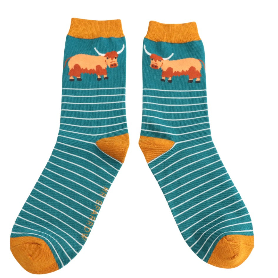 Mr Sparrow MENS Bamboo Ankle Socks - Highland Cow & Stripes - Teal Blue