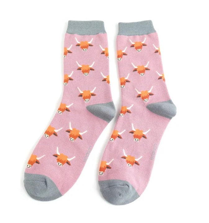 Miss Sparrow Bamboo Ankle Socks - Highland Cows - Mauve