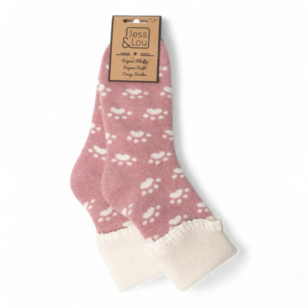 Jess and Lou - Pink & White - Paw Print Cosy Cuff Socks