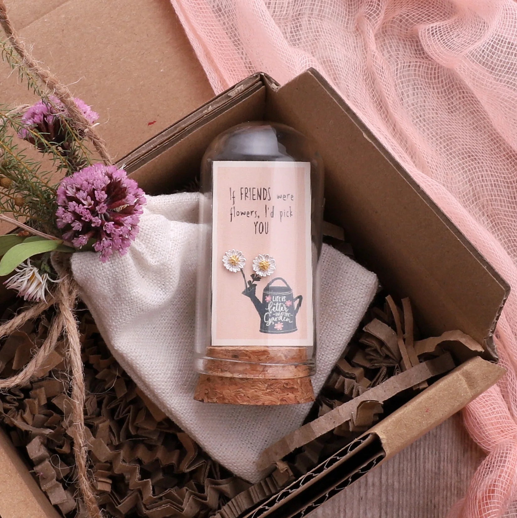 If Friends Were Flowers - Terrarium Bottle - Sterling Silver Daisy Flower Stud Earrings