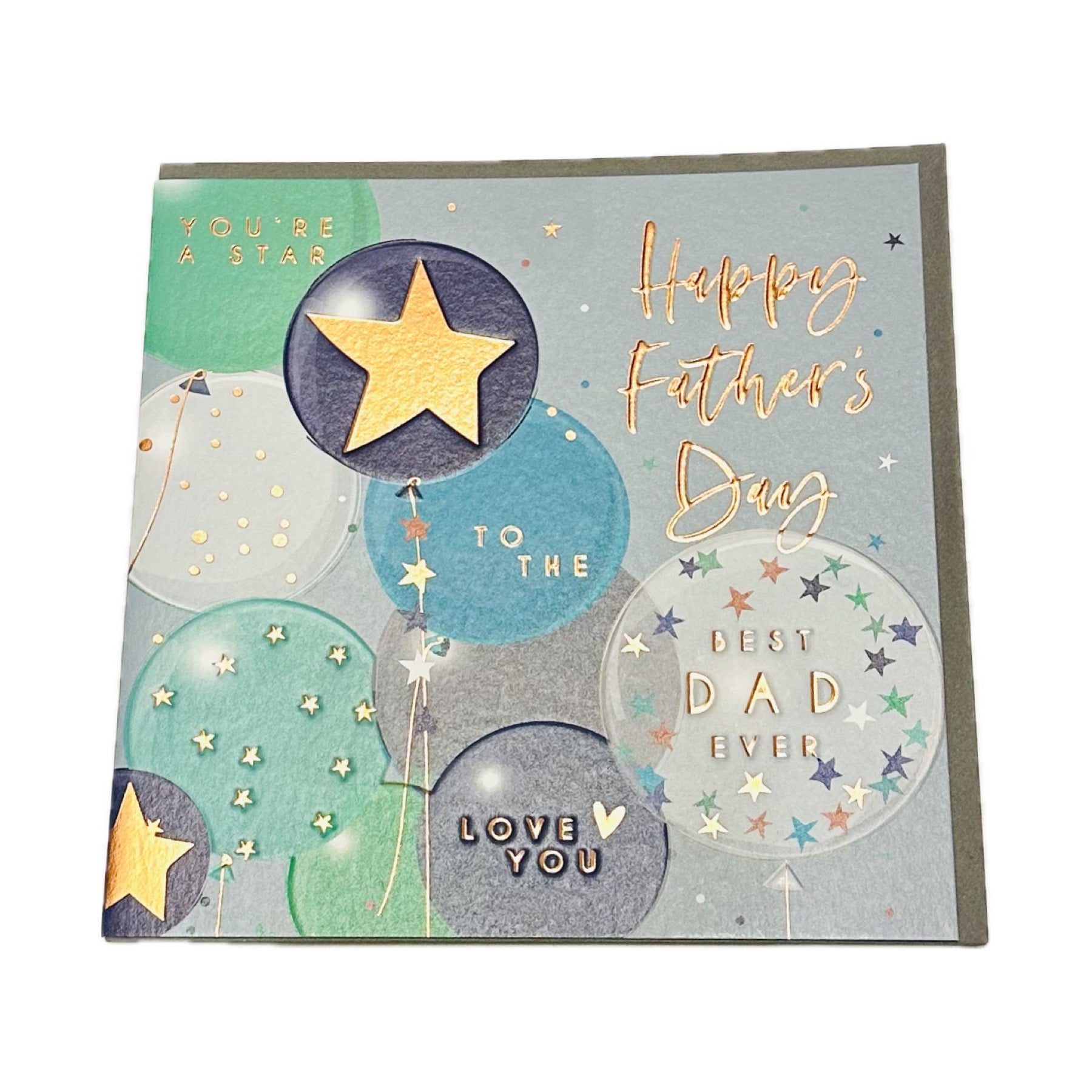 This best selling Beau range for men by Belly Button features a colourful balloons design in greys, green and blues. Finished with rose gold foil for a luxury touch and embossing for texture. A special card for Dad.