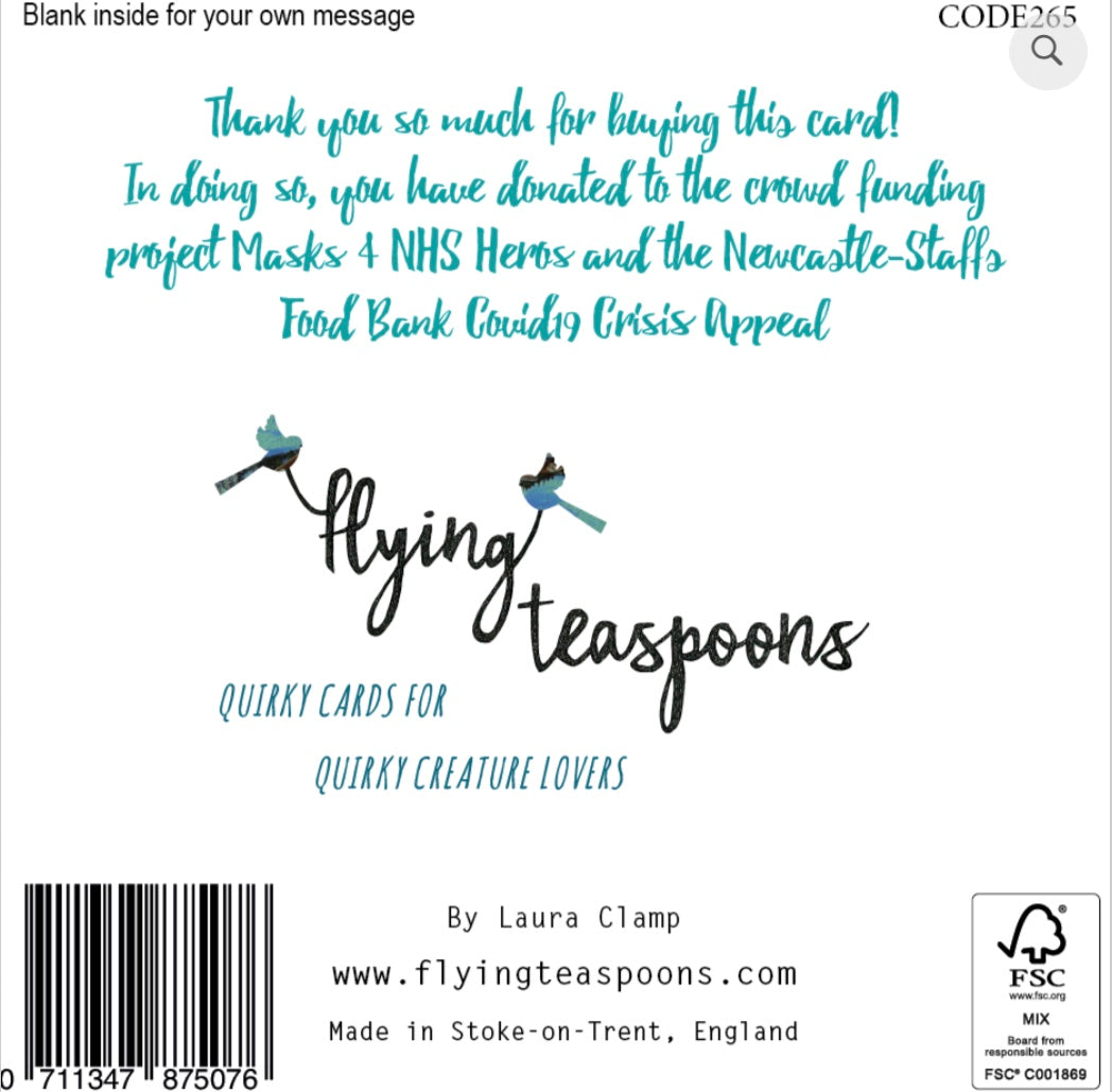 By purchasing this card donations are going direct to the crowd funding initiative "Masks 4 NHS Heros" and the Newcastle-Staffs Food Bank Covid19 Crisis Appeal two charities close to Laura’s heart.