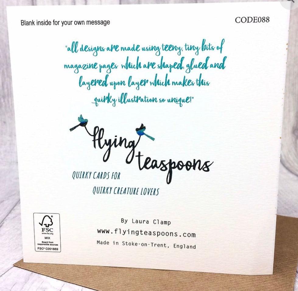 Laura from Flying Teaspoons is a talented local artist and illustrator. She makes her quirky and distinctive cards through the medium of collage. Combining a keen eye for detail, a lot of patience and a steady hand, Laura painstakingly cuts up magazine pages to find the perfect colours and textures to create all kinds of fun images and wildlife. Through the use of funny captions, Laura injects humour and aims to bring a smile or two to everyone who encounters her work. All designed in Stoke-on-Trent and printed in the UK we adore these quirky cards at Jolu!