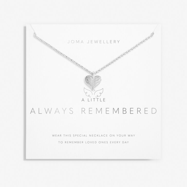 This brand new A Little 'Always Remembered' Necklace. Made to last with a sterling silver-plated chain, a silver angel wings heart pendant to front for a simple but beautiful pendant to always remind you of a loved one.