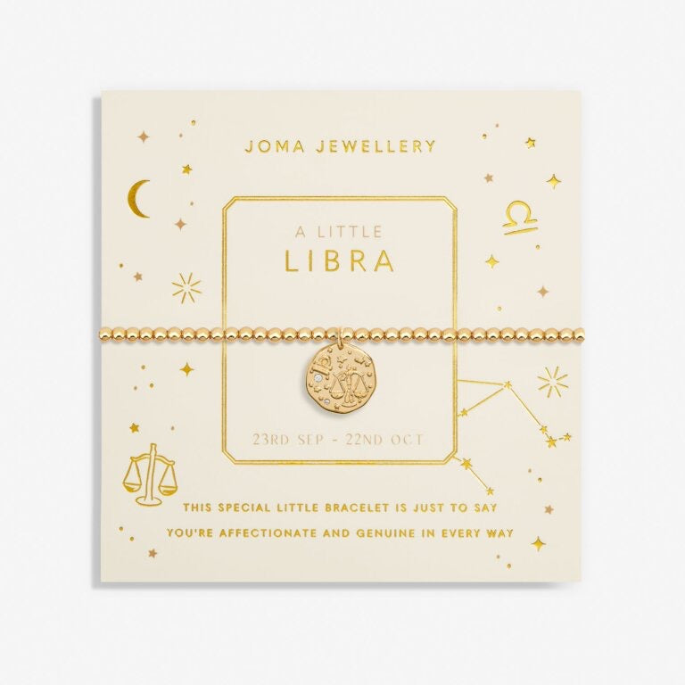Threaded with gold-plated beads, crowned with a gold-plated disc, dotted with the LIBRA Star Sign in Cubic Zirconia crystals, and wrapped around a pretty zodiac-printed card, our charming Star Sign A Little 'Libra' Bracelet In Gold Plating makes the most wonderful gift for celebrating a loved one's special day.